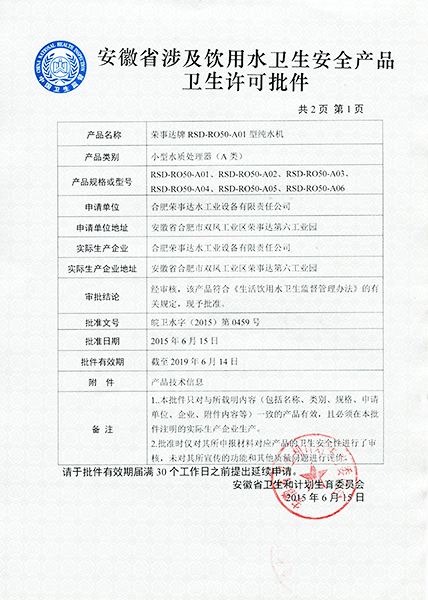 RSD-UF80型超濾凈水機衛生許...