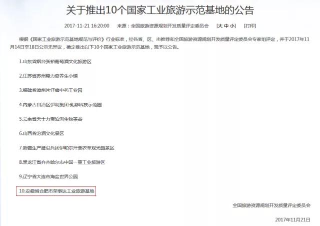 - 11月21日,全國旅游資源規劃開發質量評定委員會發布公告,公布10個國家工業旅游示范基地,安徽省合肥市榮事達工業旅游基地成為安徽省唯一入選單位。