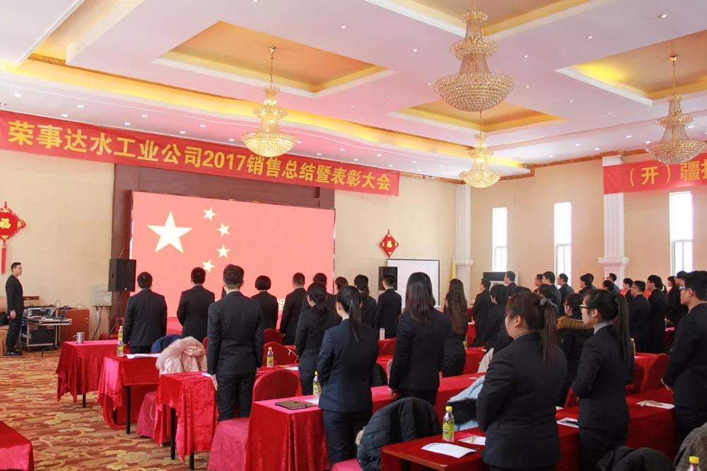 大會開場,榮事達水工業公司銷售精英起立合唱《歌唱祖國》,唱響健康中國夢,歌唱屬于自己的凱歌,洪亮的歌聲拉開了“榮事達水工業公司2017銷售總結暨表彰大會”帷幕。