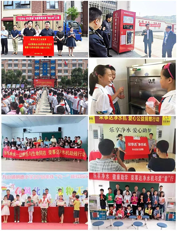 榮事達(dá)水工業(yè)從事凈水行業(yè)十余年,始終堅(jiān)守企業(yè)發(fā)展與公益事業(yè)同趨共行。榮事達(dá)自2010年發(fā)起“樂享凈水”公益行動,在全國范圍內(nèi)開展“健康助學(xué)”、“愛心助殘”、“愛心敬老”等各類公益幫扶,捐贈、安裝凈水設(shè)備數(shù)千套;向全國首個(gè)希望小學(xué)——金寨希望小學(xué)捐贈直飲水設(shè)備,并聯(lián)合金寨希望公益服務(wù)中心及地方公益協(xié)會共同發(fā)起“給山區(qū)孩子一杯水”——援建金寨中小學(xué)凈水設(shè)備公益活動,向金寨縣全縣中小學(xué)援建直飲水設(shè)備400多套,該項(xiàng)目也被評為“安徽省十佳學(xué)雷鋒志愿服務(wù)項(xiàng)目優(yōu)秀典型”;攜手中華少年兒童慈善救助基金會發(fā)起成立“健康飲水專項(xiàng)基金”,開展各類校園飲水健康保障工作;攜手安徽團(tuán)省委、省青聯(lián)啟動“青力扶貧聯(lián)創(chuàng)夢想”健康扶貧“放心水”工程,向安徽地區(qū)多個(gè)貧困村捐贈凈水設(shè)備,建立健康扶貧水站等。