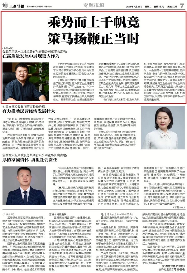• 日,《工商導報》報道了合肥榮事達水工業設備有限責任公司董事長雷鳴關于《中共中央國務院關于促進民營經濟發展壯大的意見》感悟。