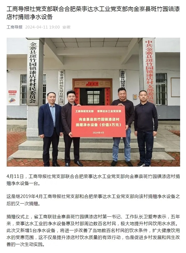 • 榮事達水工業公司黨支部攜手工商導報社黨支部捐贈凈水設備,助力金寨縣漆店村美麗鄉村建設!